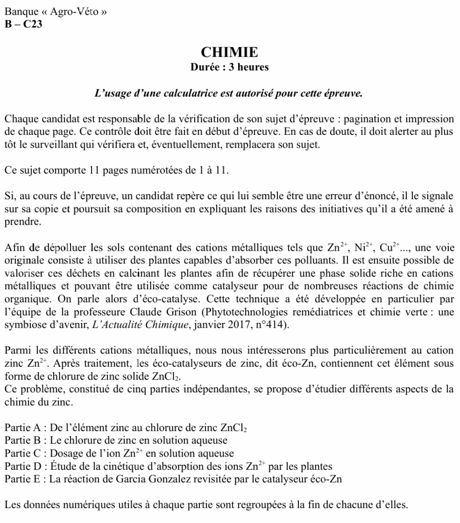 Retrouvez la correction complète et commentée du sujet de chimie du concours licence véto 2023 en libre accès sur YouTube, autour du zinc :